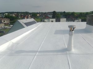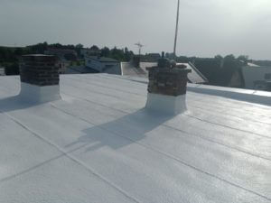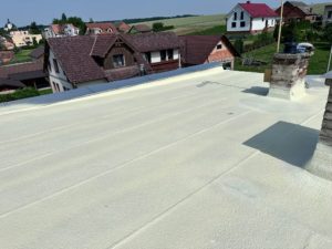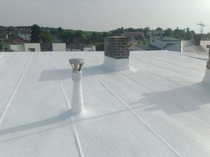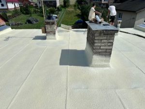 Realizace střechy – 100m2 v síle vrstvy 5cm střešní PUR pěny a následné dvě vrstvy speciálního hydroizolačního silikonového nátěru. Který díky své bíle barvě odráží až 85% slunečního záření. Střecha chladná na dotek po dlouhé hodiny i v horkých dnech.
