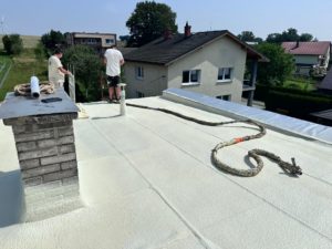 Aplikace pěny: PUR pěna se aplikuje pomocí speciálního zařízení, které směšuje a stříká pěnu přímo na povrch střechy. Pěna se nanáší v rovnoměrné vrstvě a postupně se roztahuje, čímž vytváří kompaktní izolační vrstvu.