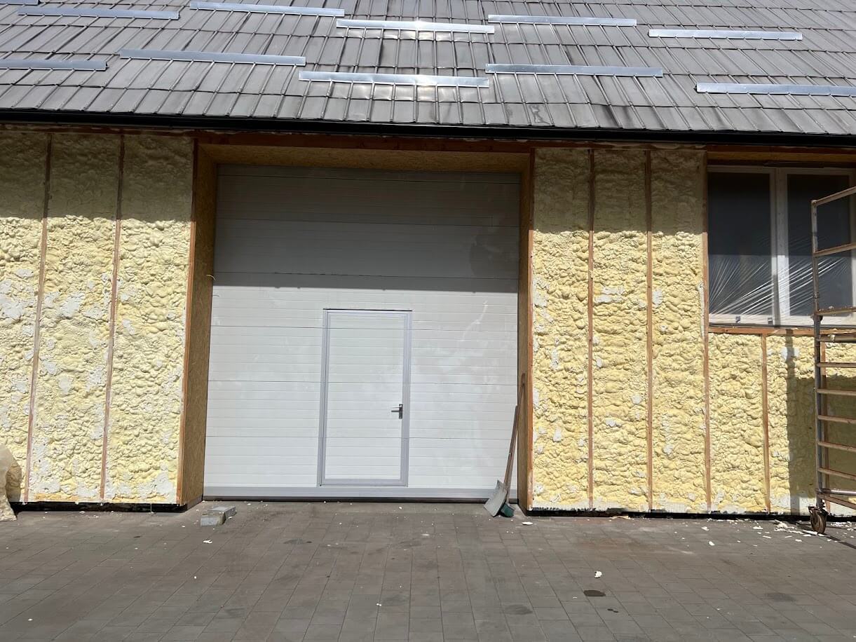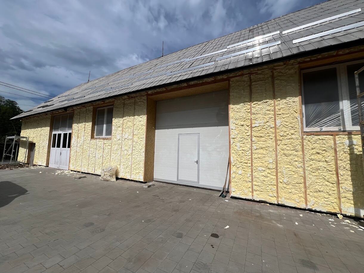 | Stručný popis projektu: Provedeno zateplení fasády objektu dílen cca 300m2 v síle vrstvy 20cm do připraveného roštu. Následně nástřel difuzní folie a zaklopení v tomto případě plechovými pláty. Více informací o tomto typu izolace ZDE: |