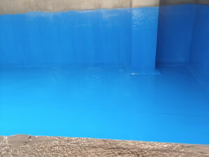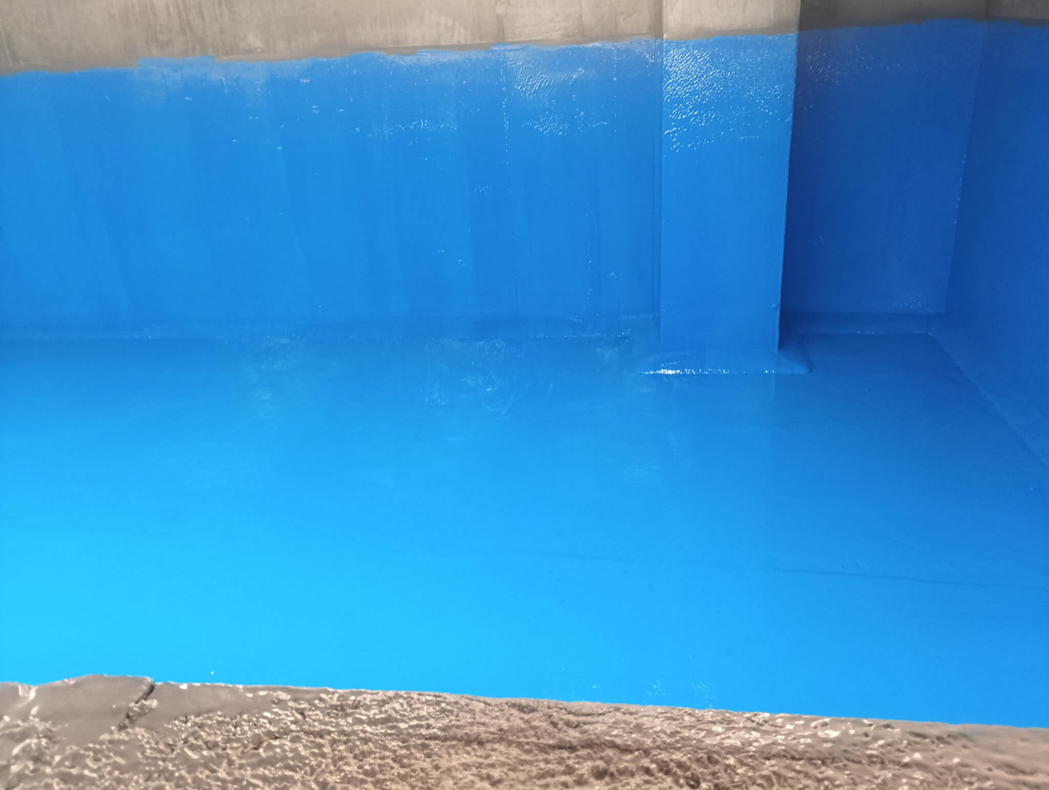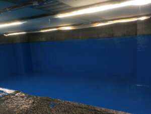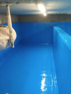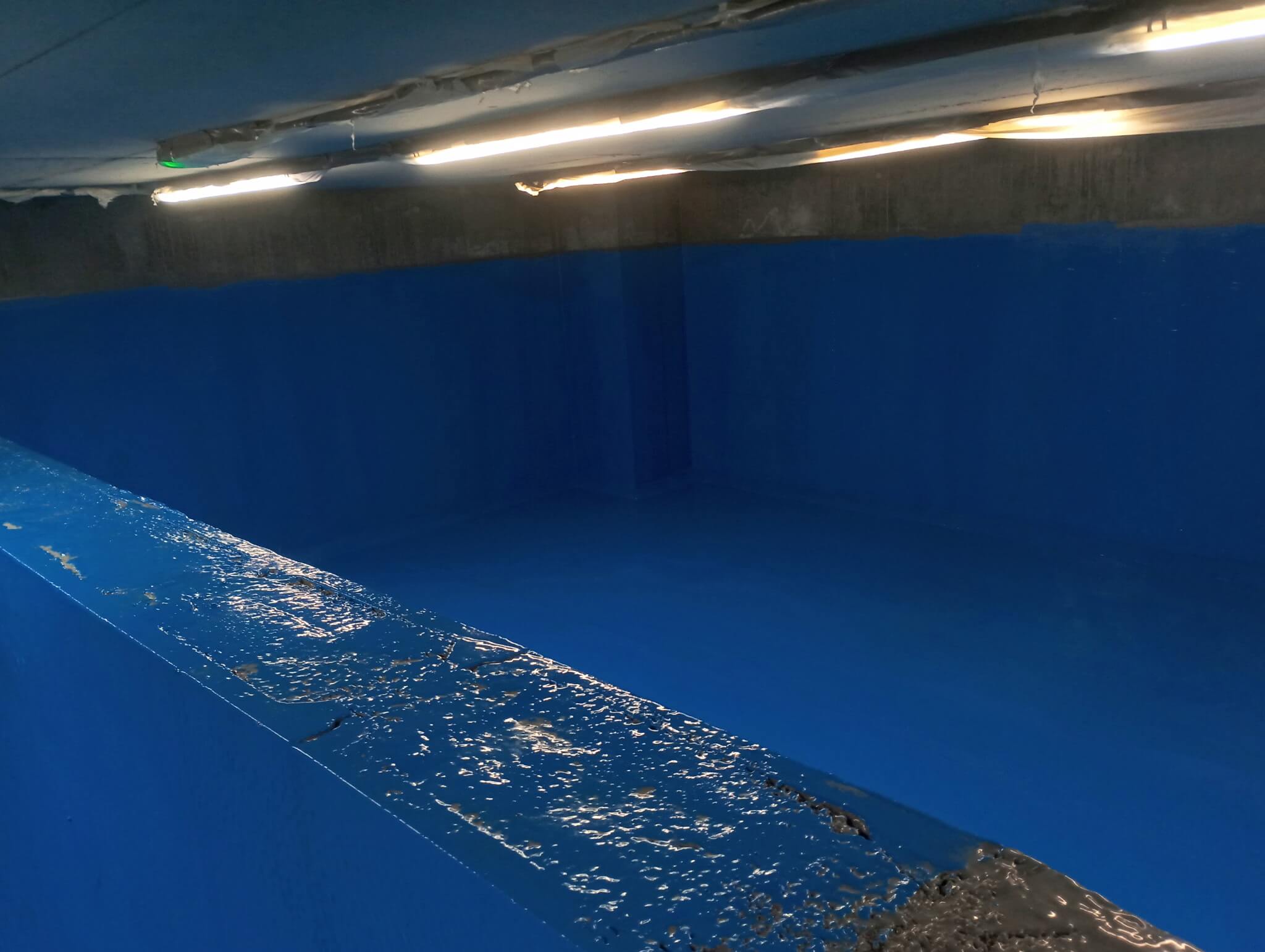 Betonové stěny a dno přepadové jímky byly nejprve očištěny, odmaštěny a mechanicky zdrsněny, aby se zvýšila přilnavost následné polyurea vrstvy. - Aplikace TECNOCOAT P-2049