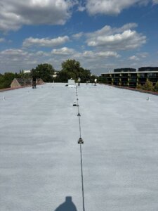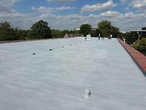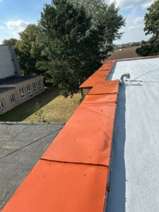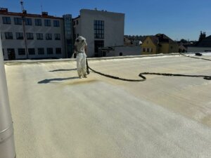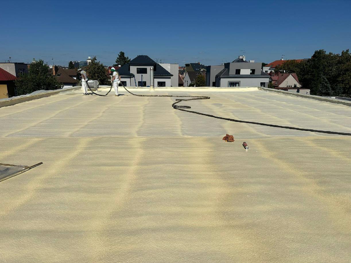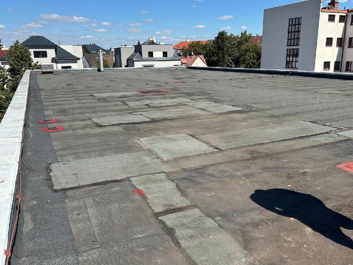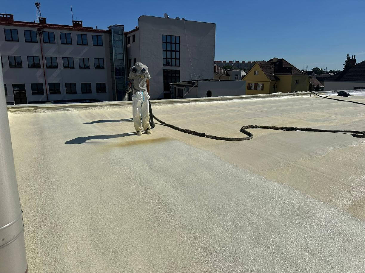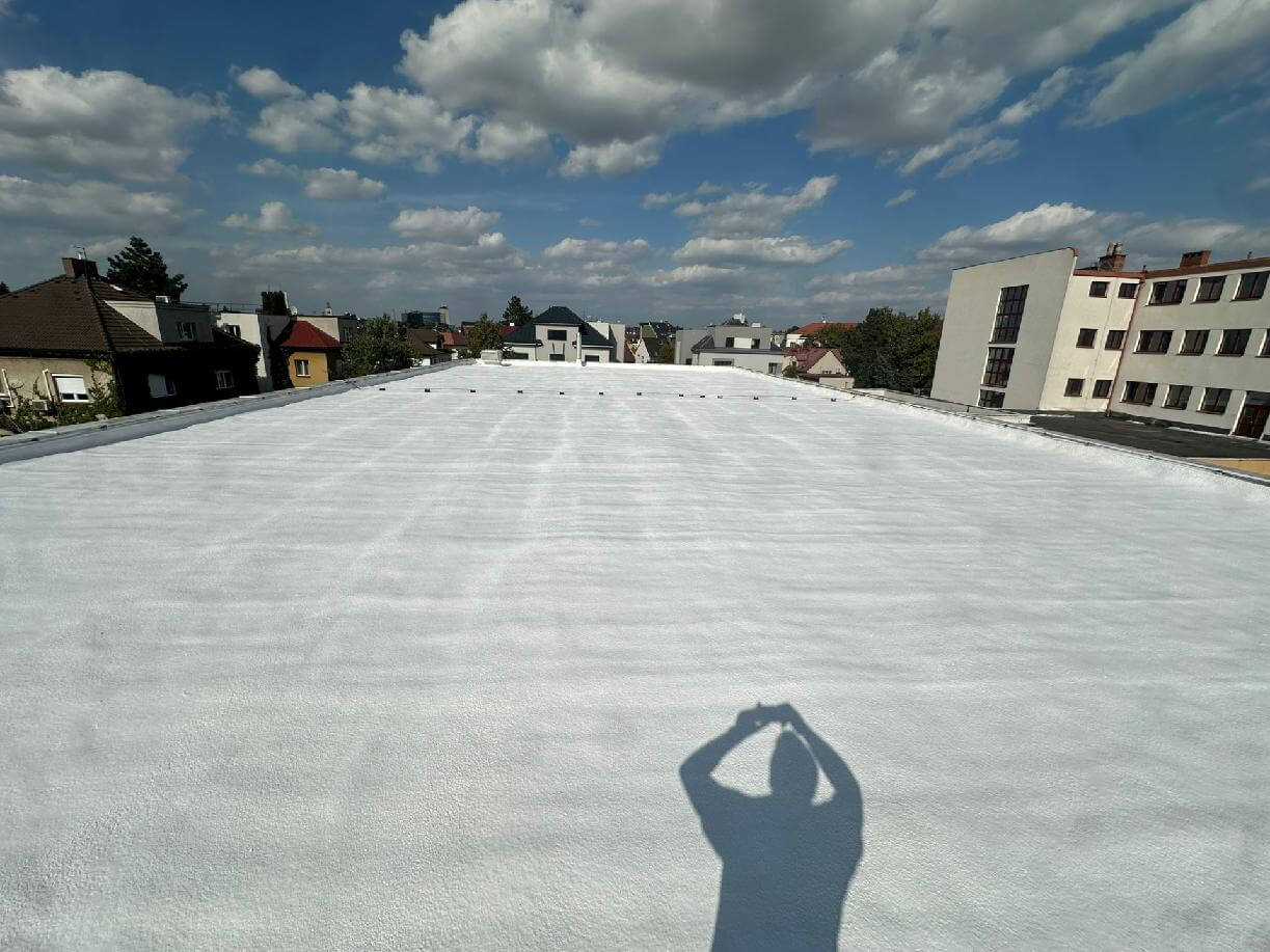 Oprava střech ZŠ Kukleny a ZŠ Jiráskova pro TS Hradec Králové – 1126m2Pro Technické služby Hradec Králové jsme realizovali opravu střech na dvou základních školách – ZŠ Kukleny a ZŠ Jiráskova. Rozsah pracíNa obou objektech proběhlo odstranění původních vrstev střešní krytiny IPA a příprava podkladu. Následně byla aplikována stříkaná PUR pěna v tloušťce 60 mm, která zajistila bezespáré zateplení a spolehlivou hydroizolaci. Povrch jsme opatřili vrchním silikonovým nátěrem s UV ochranou, který zajišťuje dlouhodobou životnost střechy. Součástí prací byla také instalace nových střešních vtoků, demontáž a opětovná montáž hromosvodného vedení, a nezbytné doplňkové stavební práce. Na střeše ZŠ Jiráskova jsme navíc provedli kompletní ošetření klempířských konstrukcí – obroušení, odmaštění, aplikaci základního antikorozního a následného krycího nátěru. Použitá technologiePUR pěna se silikonovým nátěrem představuje moderní a efektivní způsob rekonstrukce střech: