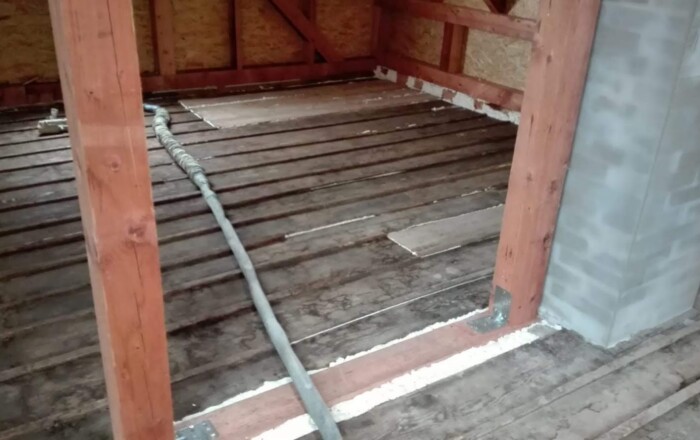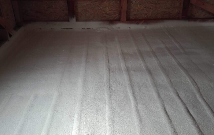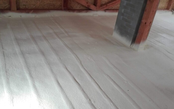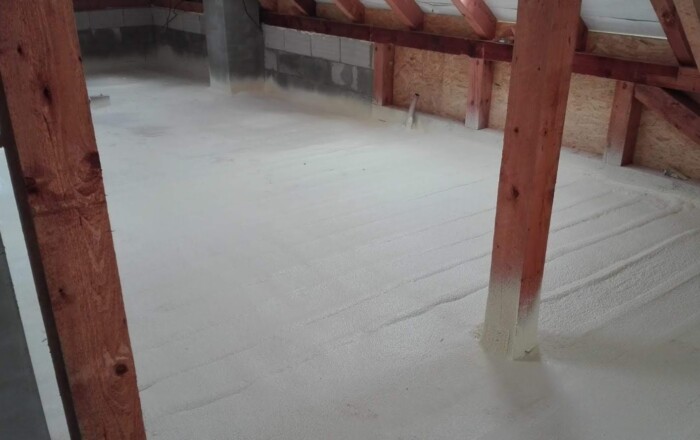 Nástřik podlahy v podkroví RD termoizolační vrstvou pěny s uzavřenou strukturou buněk.